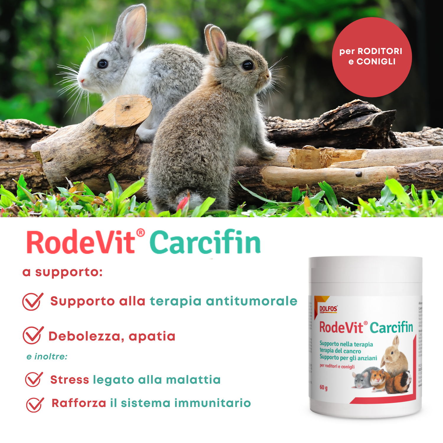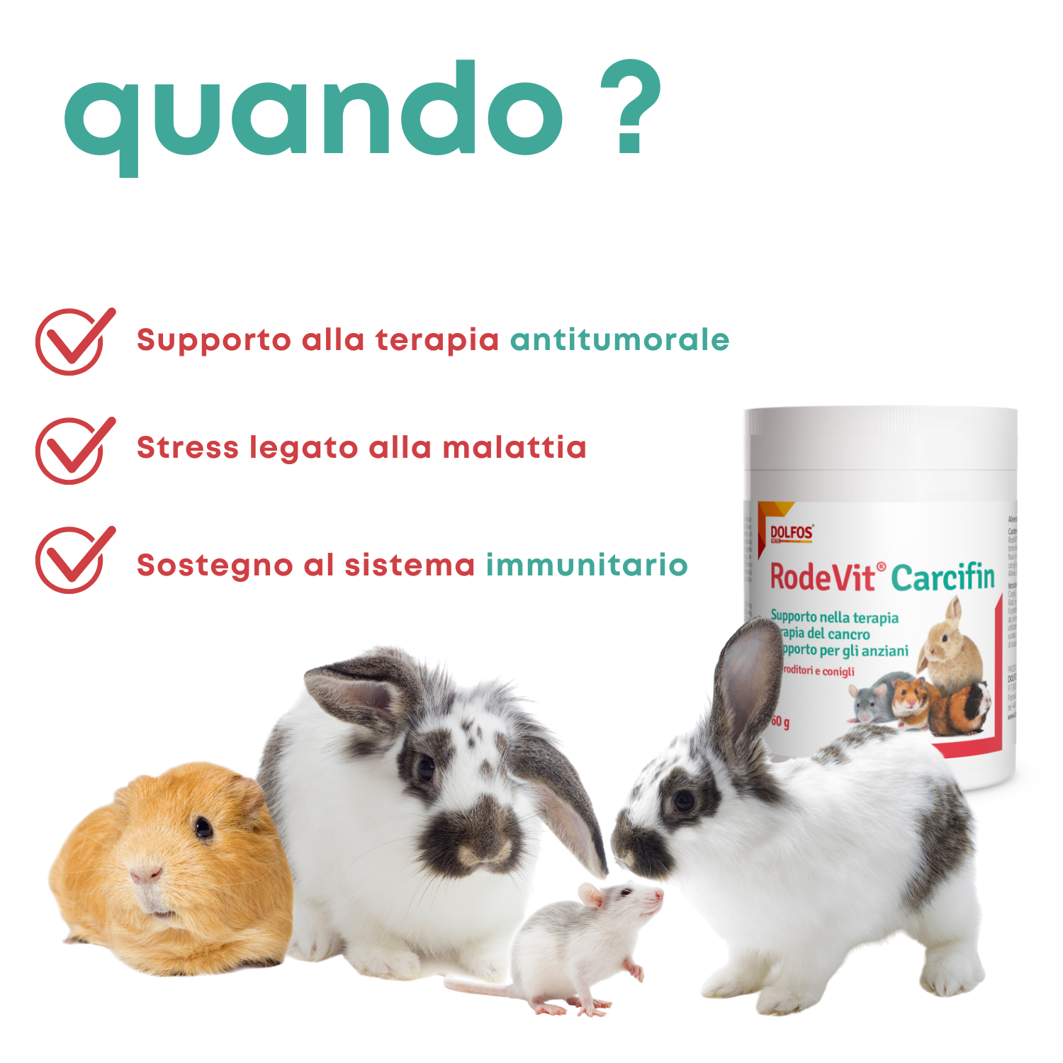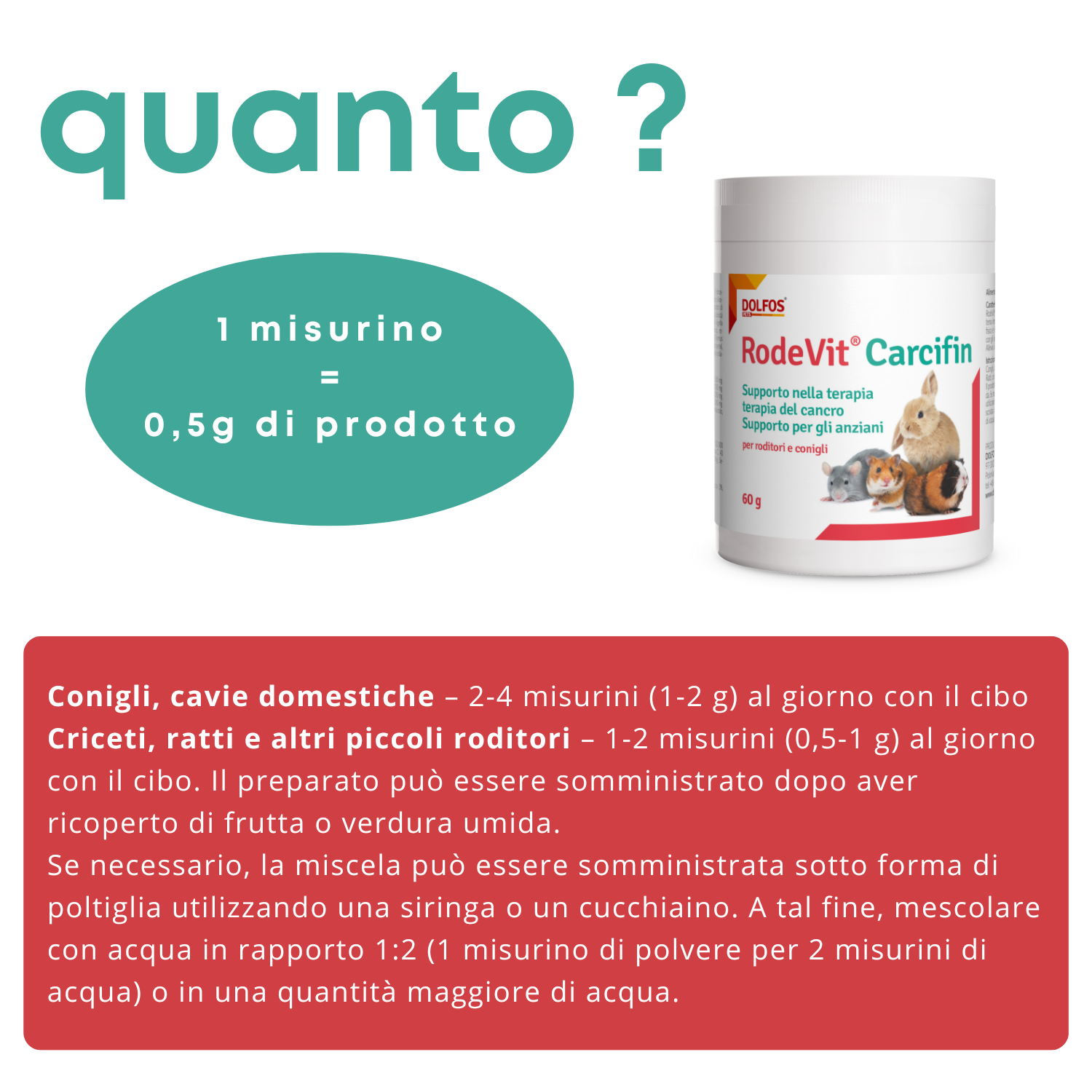 Conigli, cavie domestiche: 1-2 grammi di prodotto al giorno con il cibo