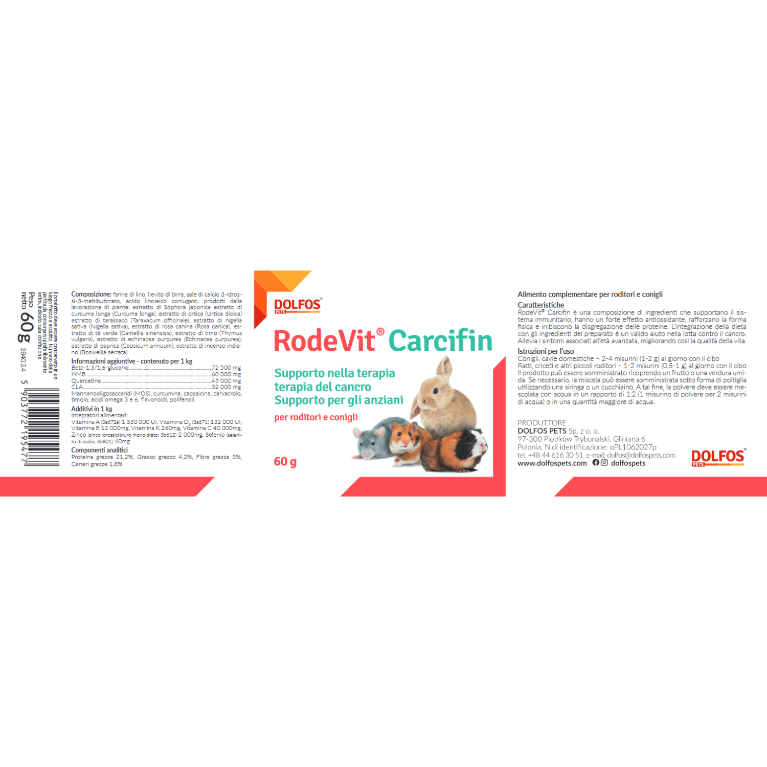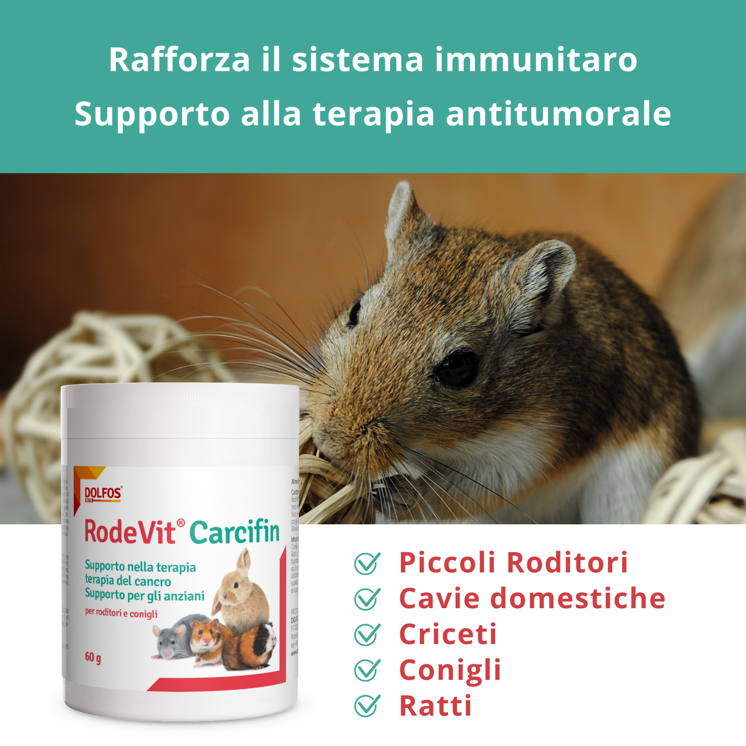 Criceti, ratti e altri piccoli roditori: 0,5-1 grammo di prodotto al giorno con il cibo. Il preparato può essere somministrato dopo aver ricoperto di frutta o verdura umida. Se necessario, la miscela può essere somministrata sotto forma di poltiglia utilizzando una siringa o un cucchiaino. A tal fine, mescolare con acqua in rapporto 1:2 (1 misurino di polvere per 2 misurini di acqua) o in una quantità maggiore di acqua.