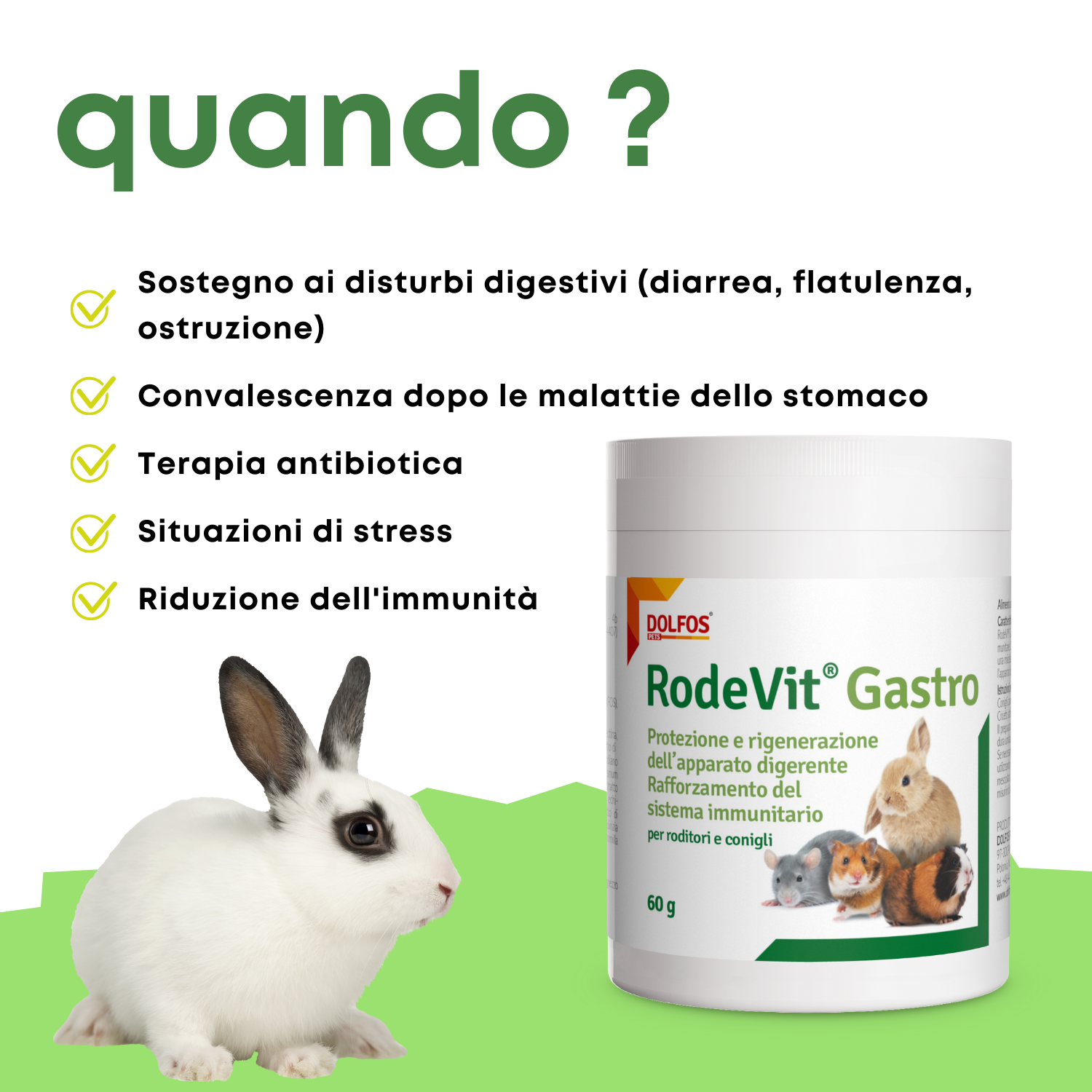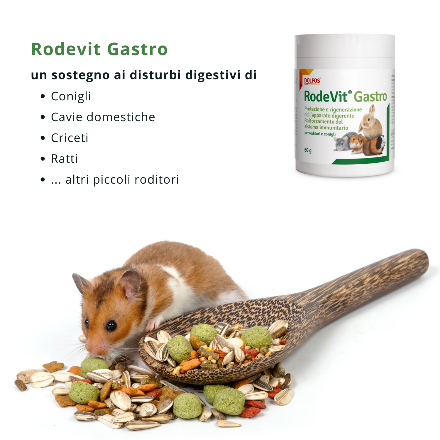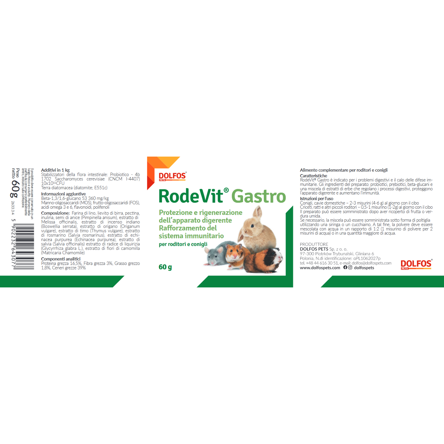 RodeVit Gastro è indicato per problemi digestivi e ridotte difese immunitarie. Componenti del preparato: probiotici, beta-glucano, prebiotici - (MOS) e una miscela di estratti di erbe che regolano il processo digestivo, proteggono l'apparato digerente e rafforzano il sistema immunitario.