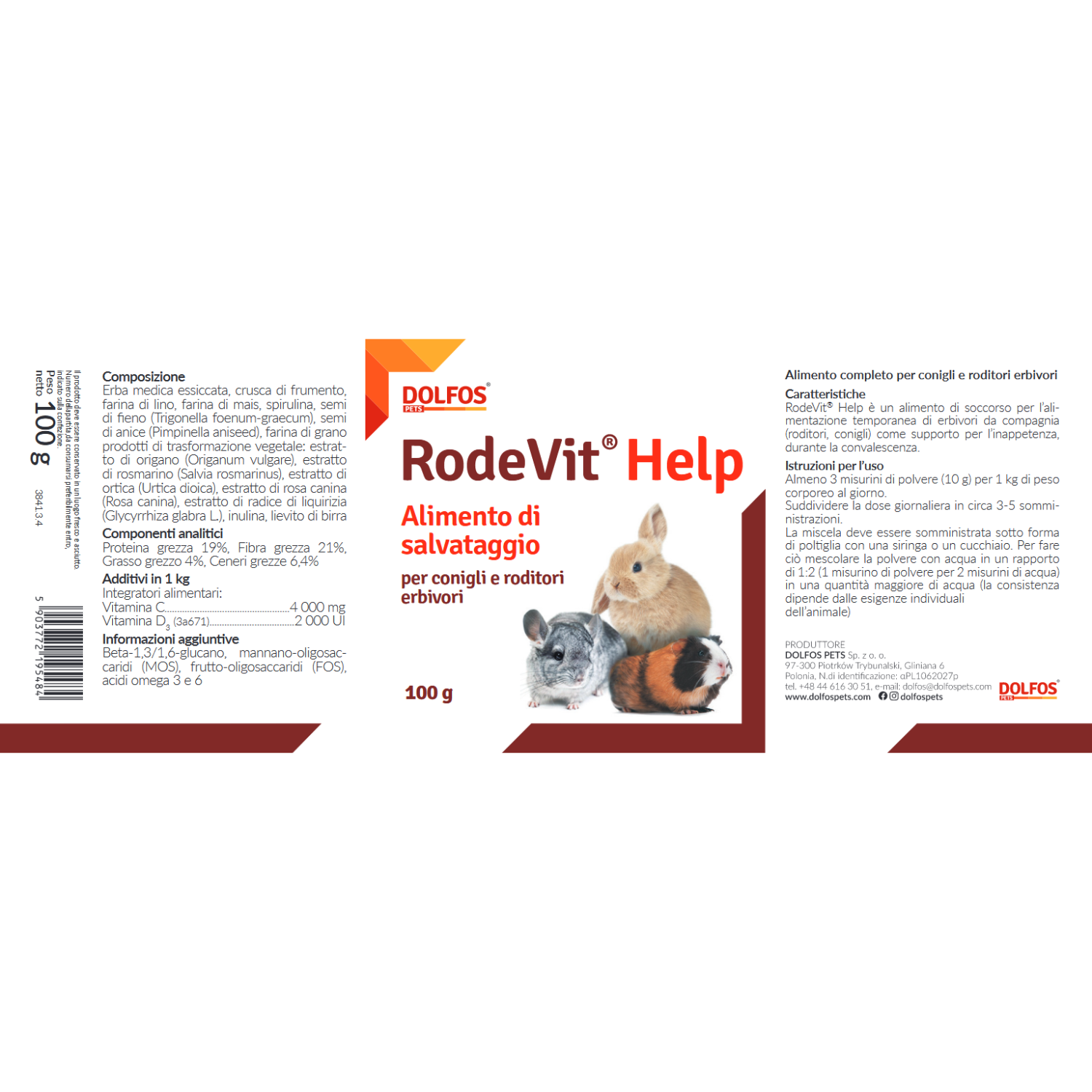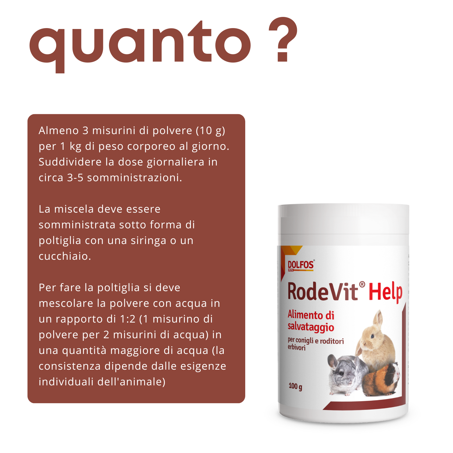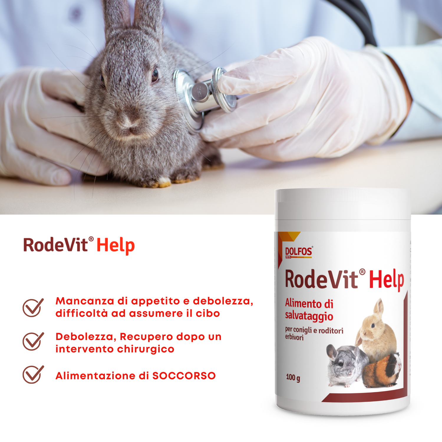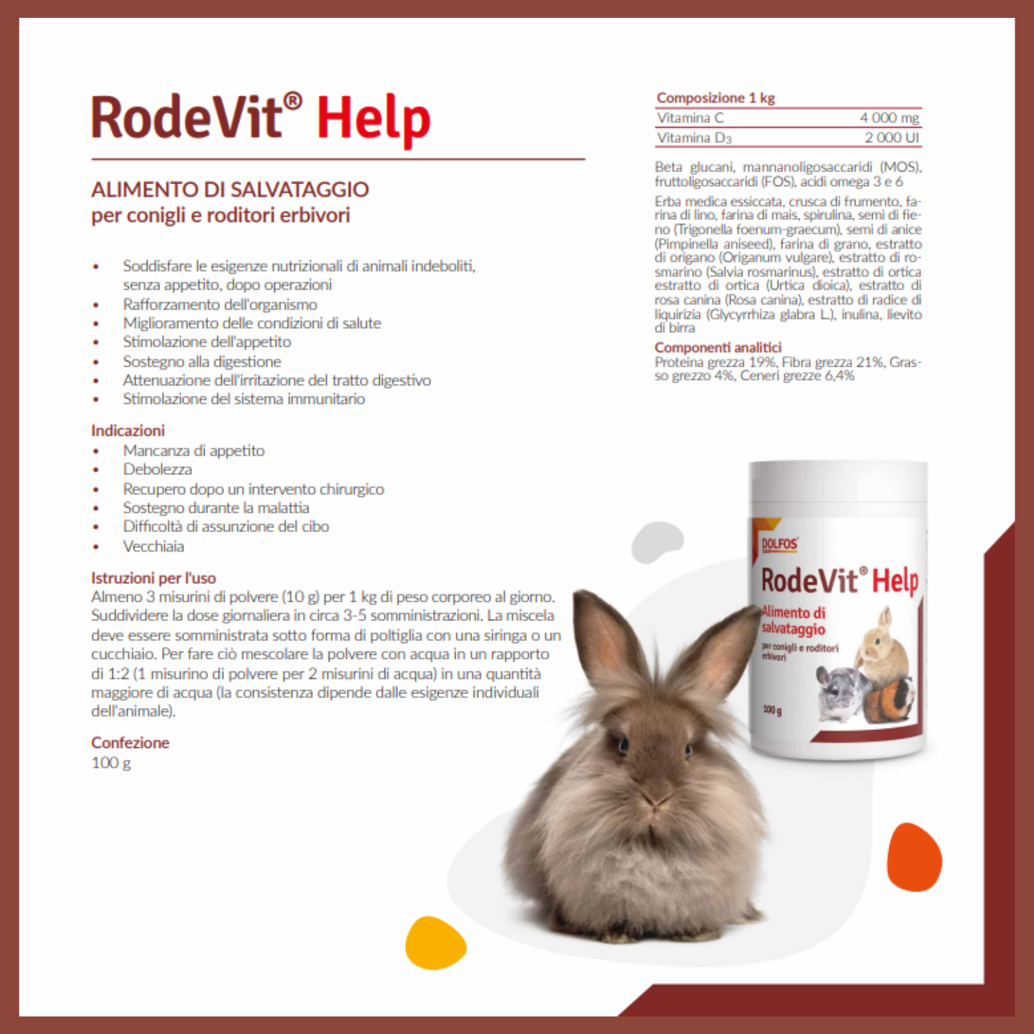 RodeVit Help è un alimento di soccorso per l'alimentazione temporanea di erbivori da compagnia (roditori, conigli) come supporto per l'inappetenza e durante la  convalescenza.
