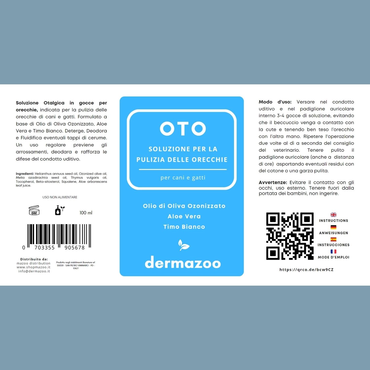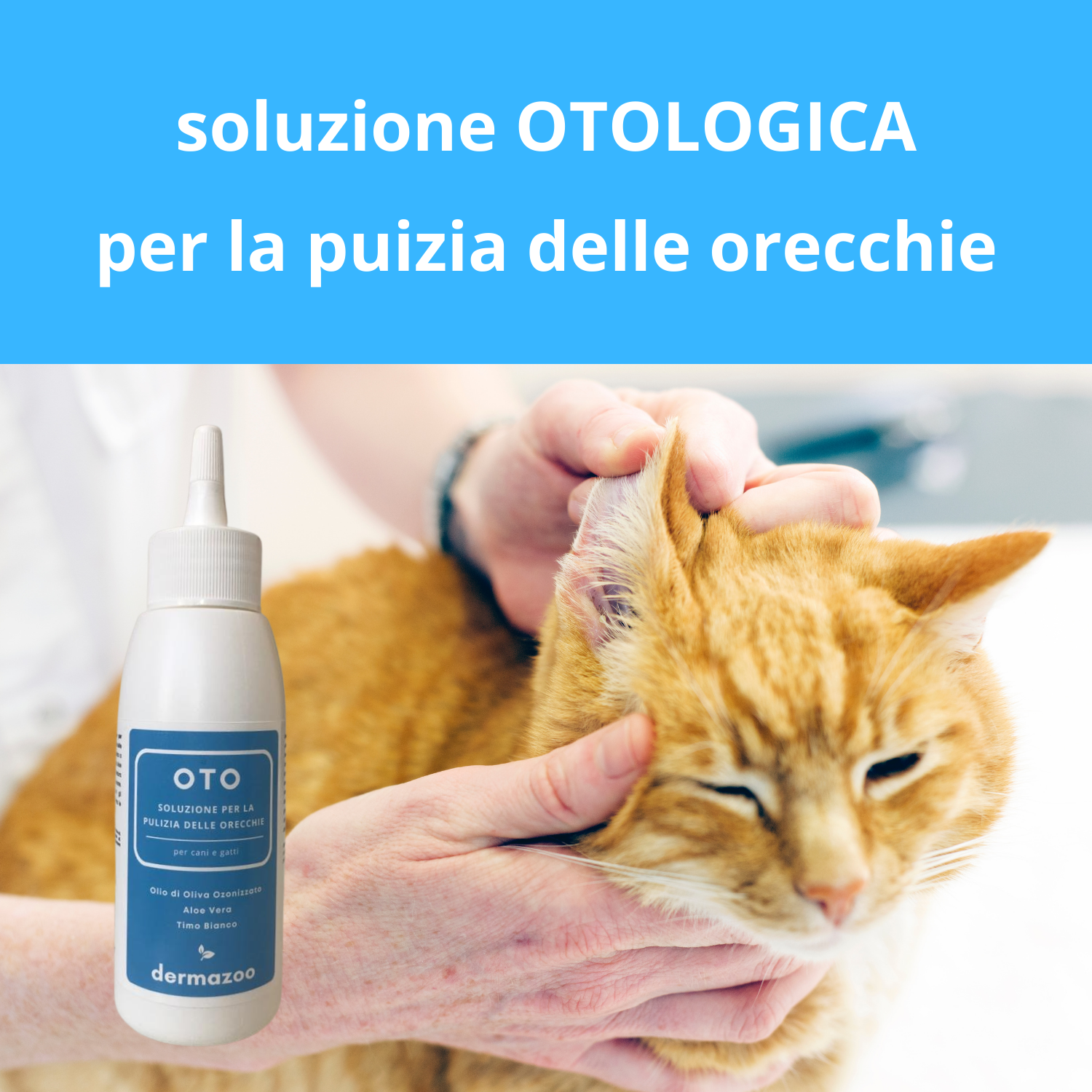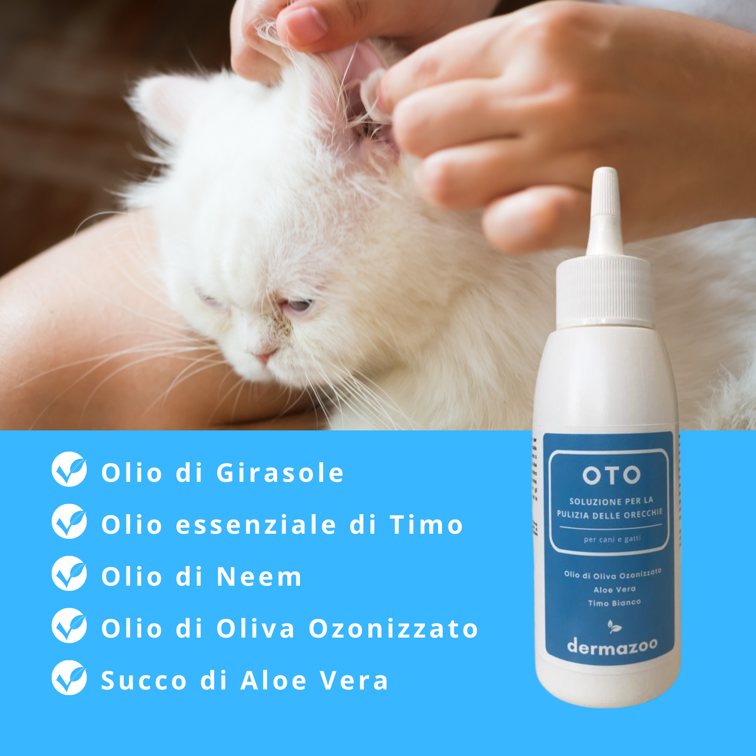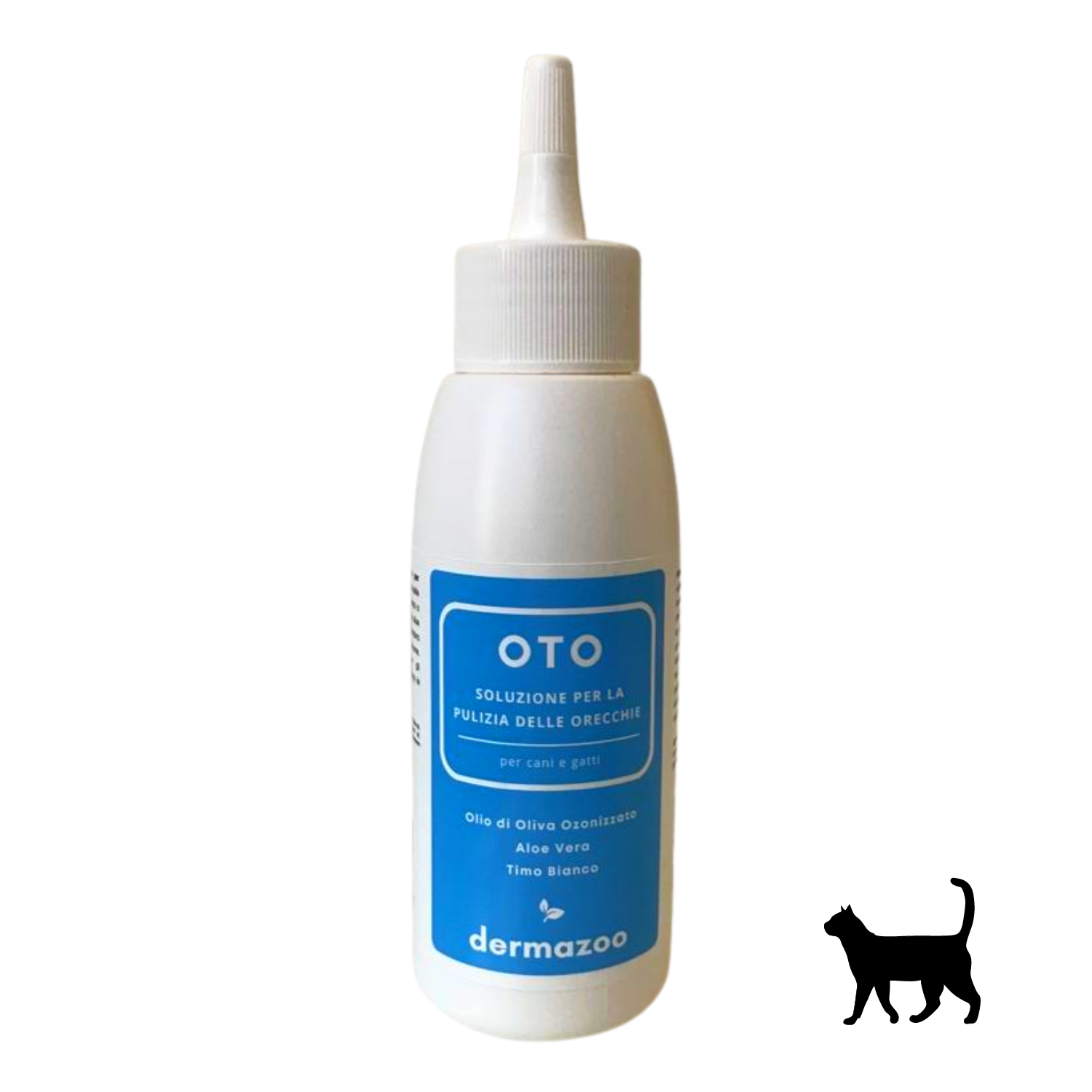 OTO - dermazoo è una soluzione specifica per la pulizia delle orecchie dei gatti. Efficace nella rimozione del cerume in eccesso, ad azione protettiva e lenitiva. A base di oli naturali di girasole, neem, timo, aloe vera e olio di oliva ozonizzato. Riduce le irritazioni.