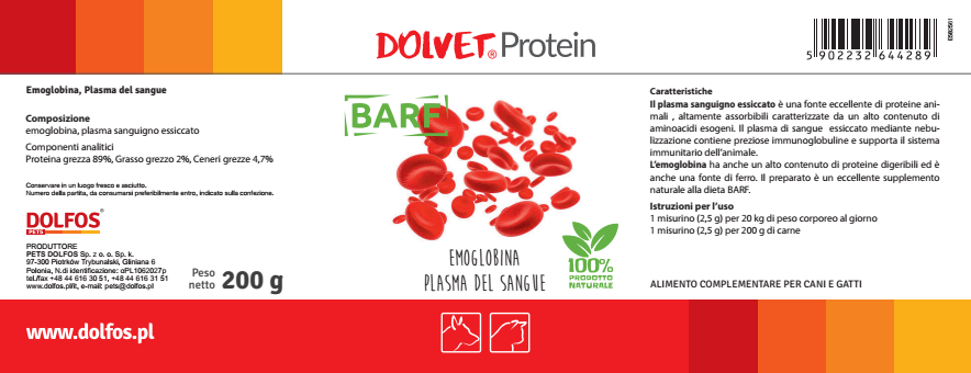Dolvet Protein Il plasma sanguigno essiccato è una fonte eccellente di proteine animali altamente assorbibili caratterizzate da un alto contenuto di aminoacidi esogeni. Il plasma di sangue essiccato mediante nebulizzazione contiene preziose immunoglobuline e supporta il sistema immunitario dell'animale. L'emoglobina ha anche un alto contenuto di proteine digeribili ed è anche una fonte di ferro. Il preparato è un eccellente supplemento naturale alla dieta BARF.